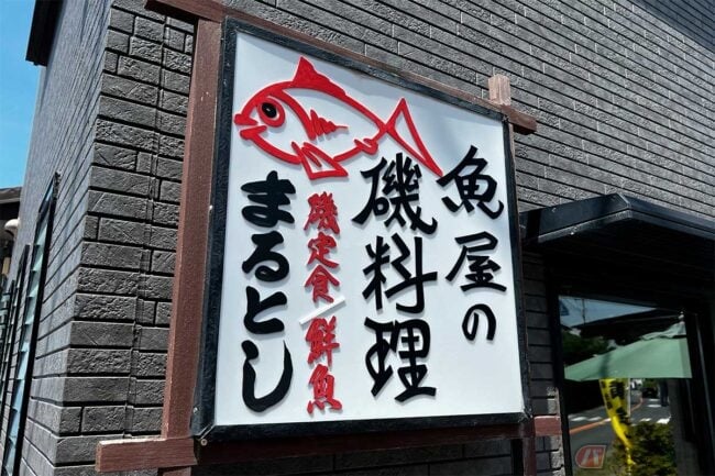 筆者が今回伺ったのは、東京湾フェリー金谷港乗り場から国道127号に出て3キロほど北上したところにある「魚屋の磯料理まるとし」です。バイクを停めようとお店に向かって左側にある駐車場に停めようとしたところ、バイクはお店を挟んで反対側(右側)の駐車場に停めるように言われました。周りに民家があるので、エンジンはすぐに切って欲しいとのことでした。