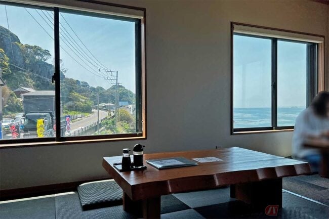 バイクを停めてお店に向かうと、平日の昼前で既に満席、外で順番を待ちます。お店は海に面しているので、天気が良い日は気持ちが良さそうです。10分ほど待って店内に入ります。
