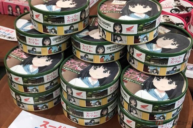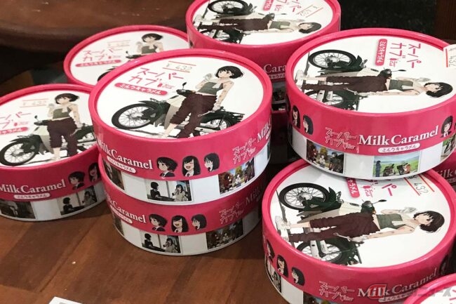 建物の入り口を入ってすぐの所にスタンプコーナーが設置されていて、キャラメルやプリントクッキーなど、アニメのスーパーカブ関連アイテムも販売されています。