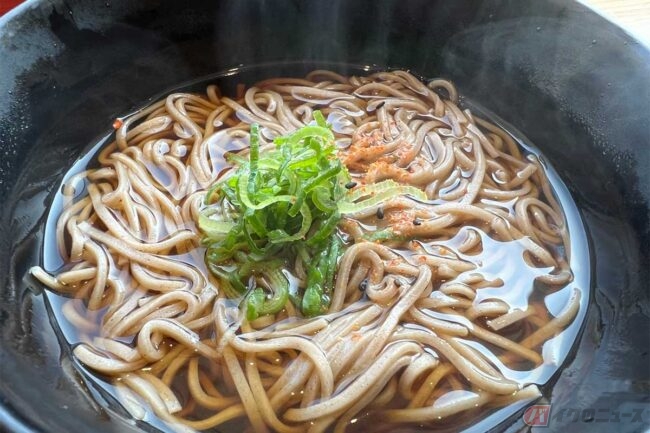 6時から10時にオーダーできる朝食メニューには、「朝のおにぎりそばセット」(500円)と「朝の和定食」(550円)があります。今回は「朝のおにぎりそばセット(温かいそば)」をオーダー。そばはうどんに変更可能で、麺は「温」、「冷」どちらかを選択します。