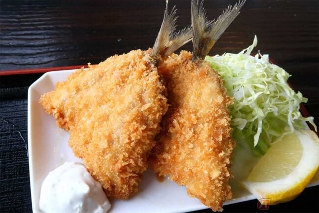 さて、勝浦産のアジをいただきます。揚げ具合が良いサクサクの衣、身は締まっていますが適度に柔らかく、コクがある味です。太平洋を流れてくる黒潮の恩恵を受けたアジでしょうか。味もボリュームも申し分無しです。