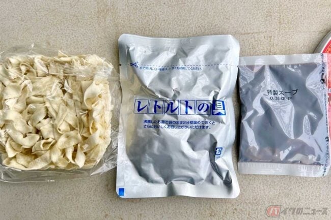 中身を見ると、極太麺(冷風乾燥ノンフライ麺)とレトルト具材(味噌仕立てのかぼちゃ、さといも、にんじん、豚肉)、液体の特製スープが入っています。