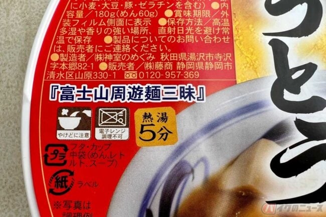 こちらの商品は株式会社藤商という静岡市の会社から販売されている「富士山周遊三昧」シリーズのひとつらしく、ほかにも「桜えびの塩ラーメン」や「富士宮やきそば」(各486円)のカップ麺、それに「冷凍富士宮焼きそば(3食入)」(1620円)などもラインナップされているようです。