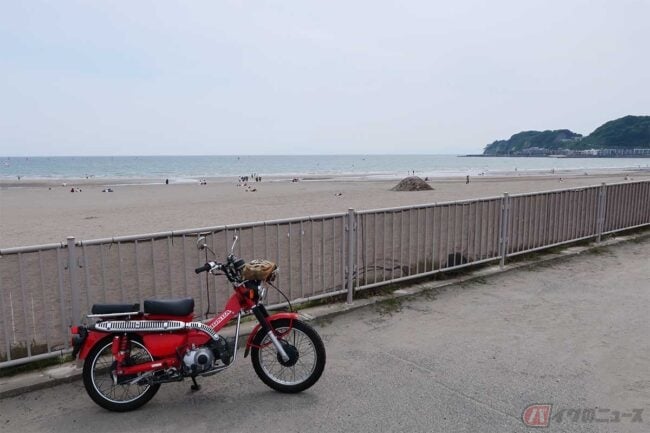 大石段を昇り本殿にお参りをして八幡宮を後にします。若宮大路から路地に入り、平日でも賑わっている小町通りに抜けて駐車場に向かいます。「CT110」を駐車場から出して裏道を通り、鎌倉の雰囲気を堪能しながら由比ヶ浜に出ました。先ほど胃袋に納めたアジも泳いでいたであろう相模湾を見ながら一休み。古都の雰囲気と美味しいアジフライの余韻に浸りながら帰路につきました。