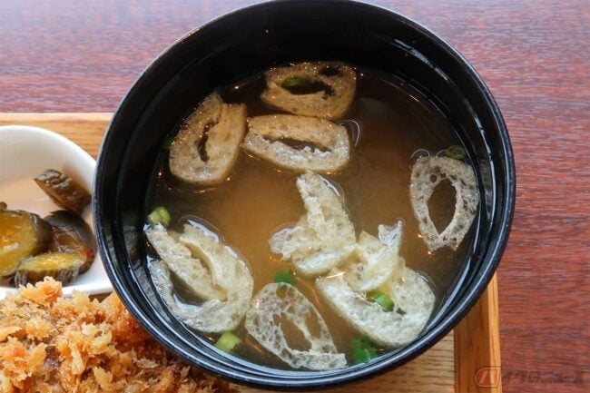 揚げ具合もサクサクして良い感じ、身はジューシーで下味の塩がうっすら効いています。トレイには、ご飯とみそ汁、小鉢がふたつと漬物が並びます。アジは相模湾産(この日は長井漁港)、ご飯は、湘南そだち米のキヌヒカリ、みそ汁の具は、鎌倉わかめと鎌倉産油揚げ、といった具合で地元の食材に拘っています。