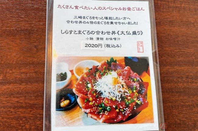 窓際のテーブルに案内されて席につきます。なぜか隣のテーブルにはクマの大きなぬいぐるみが座っています。気になりつつもメニューを見ると、一番上に相模湾産のアジと銘打った「アジフライ定食」があったので迷わず注文しましたが、通常の合わせ丼の4倍マグロが乗っているという「しらすとまぐろの合わせ丼(大仏盛り)」という魅力的なメニューもありました。