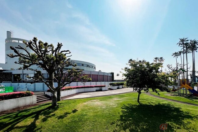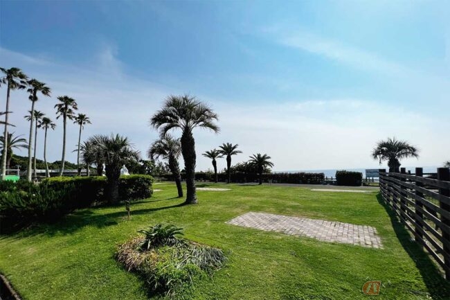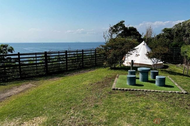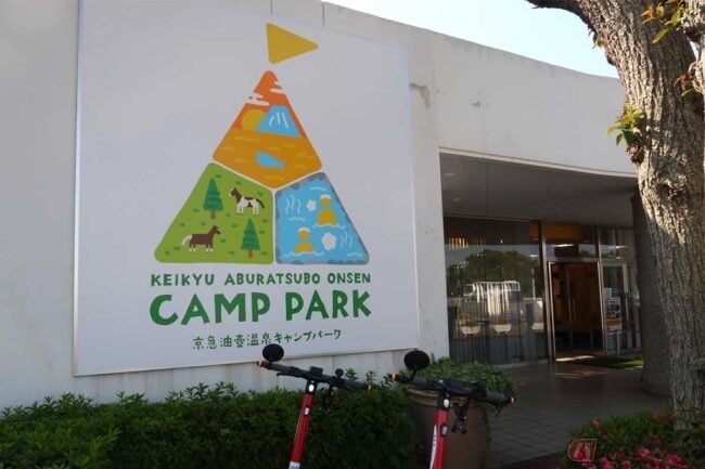 お店を出てマリンパークのあった場所に向かいます。バイクで1分もかからずに到着。なんと「京急油壺温泉キャンプパーク」というキャンプ場になっているではないですか。見学ができると言う事で中に入らせていただきました。今年(2022年)の2月にオープンしたばかりだそうです。