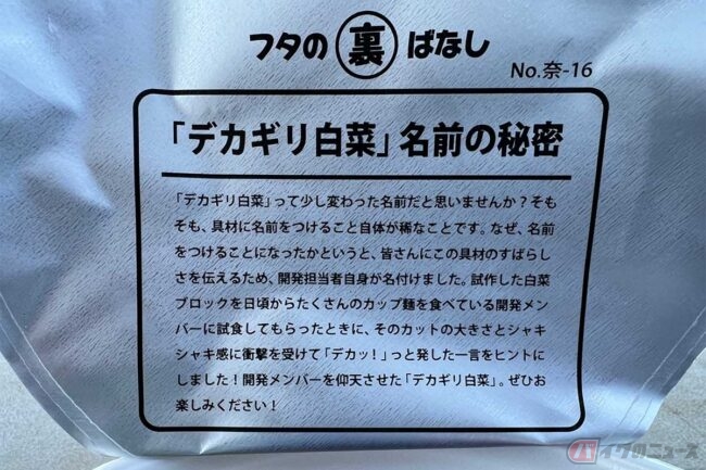 凄麺シリーズでは裏蓋に製造者のこだわりなどが記載されていて、食べながら読むのも面白いものです。ここには「デカギリ白菜」というネーミングの秘密が書かれていました。試作した白菜ブロックを試食した時に、カットの大きさとシャキシャキ食感に衝撃を受けて「デカッ!」とスタッフが発した一言がヒントとなったようです。