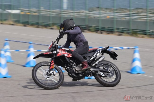 車幅もスリムなのでニーグリップがしやすく、ダイレクトに足腰で車体のバランスを取りやすい印象です。また、試乗中にオフロードレッスンでも習った、スタンドの姿勢になって運転もしてみました。この場合でも、ステップの位置とハンドルとの位置のバランスは、個人的によくて足つきが悪いと身長的に合ってないのかなと思っていたし、運転している時も姿勢が悪くなってしまうのでは、と心配していましたがそんなことはありませんでした。