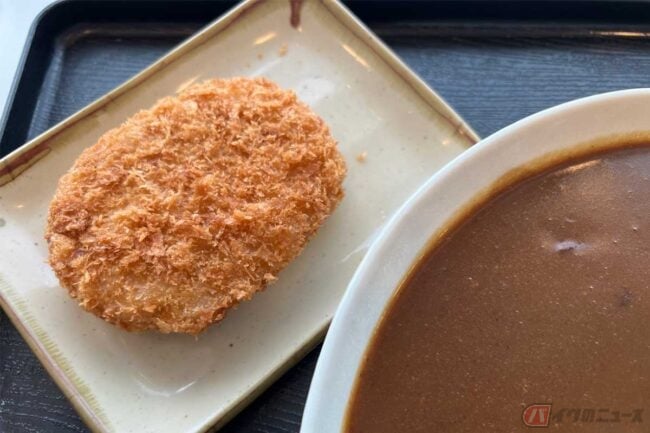 サイドメニューに「さといもコロッケ」(150円)もオーダーしました。里芋ならではの粘り気があり、なかなかの食べ応えです。カラッと揚げられたとんかつとは対照的に、里芋のしっとり感が絶妙にマッチ。最後はこのコロッケもカレーに「イン」しましたが、とんかつの立場が危うくなるくらい相性が良かったです。