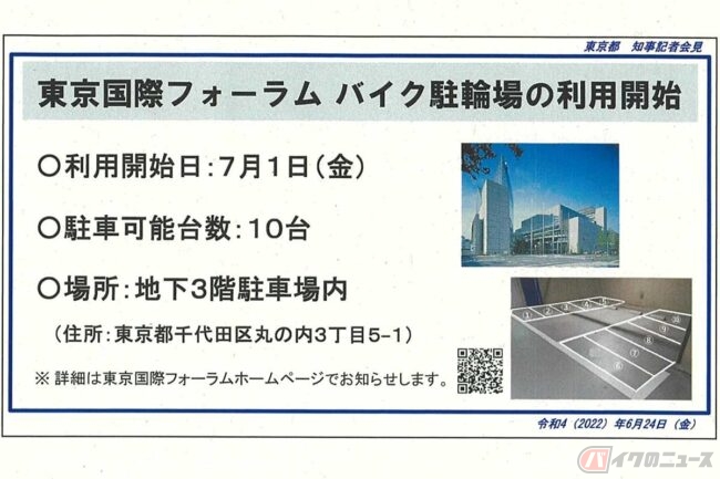 小池百合子東京都知事は、2022年6月24日午後の定例会見で、「東京国際フォーラム」の地下3階にバイク専用駐車場10台分を設置し、同年7月1日から利用を開始することを話しました。