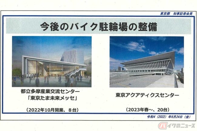 小池氏は、このほかにも東京2020オリンピックパラリンピックの水泳競技会場となった「東京アクアティクスセンター」(江東区辰巳)で2023年春に20台、2022年10月に新規オープンする多摩産業交流センター「東京たま未来メッセ」(八王子市)でも8台のバイク駐車場を整備します。