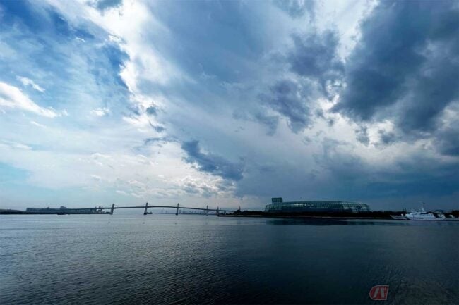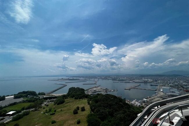 エレベーターで屋上のスカイデッキに登ると、太平洋やいわきの街並みが360度望めます。なかなか気持ちの良い展望台です。ここでまた見つけてしまったのが、巨大な橋です。タワー2階の展示コーナーに橋の説明を発見、それによると2018年に完成した「小名浜マリンブリッジ」とのこと。国際物流ターミナルと埠頭に渡る全長927m(海上は510m)という巨大な橋でした。