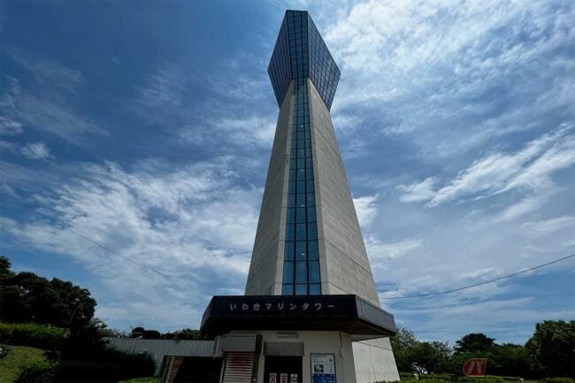 食後に小名浜をもう少し見ようと港に戻ると、北側の丘の上に不思議な建造物が見えます。「デザイン灯台か? 何だ?」と向かってみると「いわきマリンタワー」という標高46mの三崎公園の中に建つ、高さ59.99mの展望塔でした。