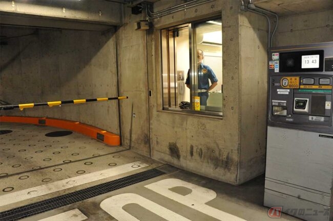 出庫は、バイク駐車スペースが清算機のすぐ近くなので、そこにある「駐車場管理事務所」に“歩いて”行き、利用案内用紙を提示して清算します。清算後に駐車しているバイクに戻るのは、駐車場が一方通行だから。ほんの10メートルほどですが、逆走による事故を防ぐためです。9区画を出て7区画で外周をショートカットして再び出口へ行くと、係員がゲートを開けてくれます。
