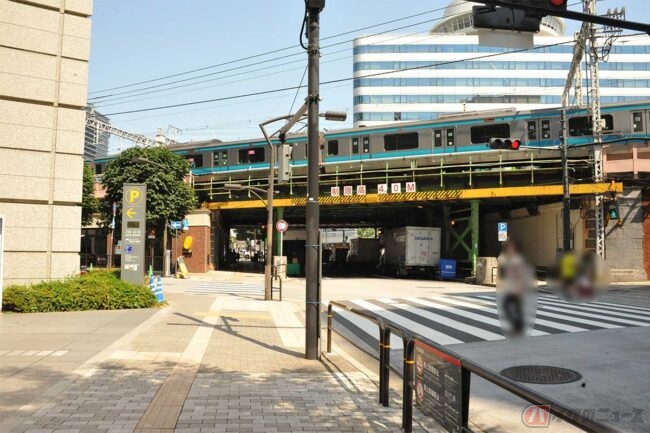 来場者は東京駅丸の内側と有楽町駅側の両方を利用できますが、車両の入庫は有楽町駅側から。駐車施設は入庫口から出庫口まで一方通行、バイクも矢印に従って進みます。入庫口からバイク駐車場のある地下3階までは、ほぼ一直線の下り坂です。