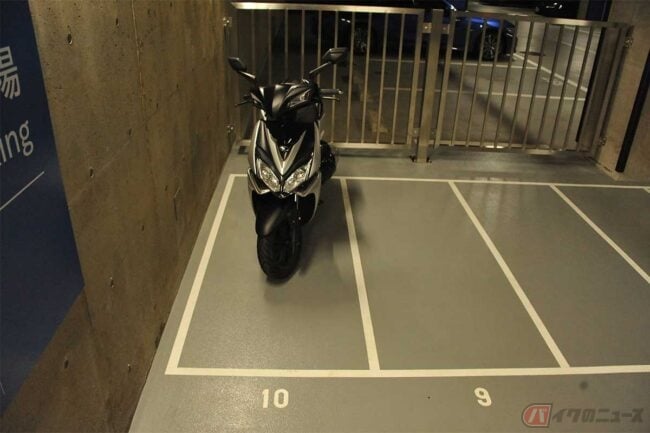 規定上は幅1m、長さ2.5m以内の自動二輪車と原動機付自転車の駐車が可能。駐車枠にゆとりがあるだけでなく、枠外の転回スペースも広めです。満車状態の出庫時、他の駐車車両をかわすのに苦労する、ということも少なそうです。