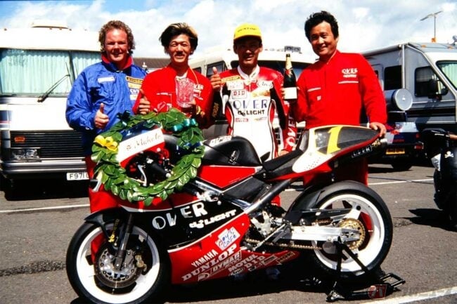 そう語る佐藤さんの転機になったのは、ヤマハ「SRX600」用エンジンを独創的なアルミ楕円パイプフレームに搭載する、OV-11です。1991年にオランダのアッセンで開催された国際シングルレースで、このマシンがポールtoフィニッシュという形で劇的な初参戦初優勝を飾ったことで、OVERの名前は瞬く間に欧州全域に知れ渡りました。