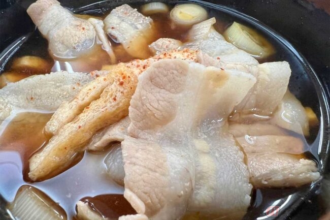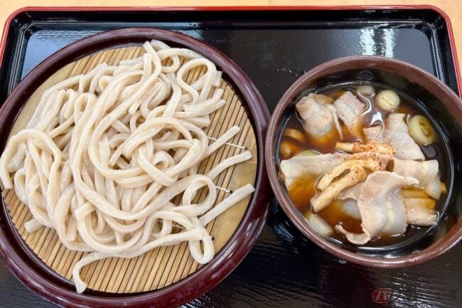 そんな中「埼玉名物肉汁うどん」(850円)を見つけ、これに決定! 看板に書かれている通り、ネギと豚肉がたっぷり入った甘めの肉汁にコシのある武蔵野うどんをつけて食べます。やはりここでも準主役は豚肉。武蔵野うどんは食べ応えも抜群です。埼玉県の街道沿いにも武蔵のうどんのお店は多くあり、手打ち風の不規則な麺が多いところ、ここでは流石に機械で製麺されているのか均等な太さの麺でした。