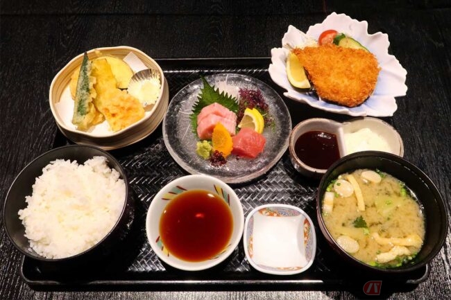 ジョッキのビールを飲み終わるくらいのタイミングで「アジフライ御膳」がやってきました。聖地松浦のアジフライが1枚、付け合わせはキャベツの千切りにキュウリとトマト、タルタルとウスターらしきソースが付きます。マグロの刺身が2種類、野菜の天ぷら、ご飯とみそ汁で「アジフライ御膳」となります。