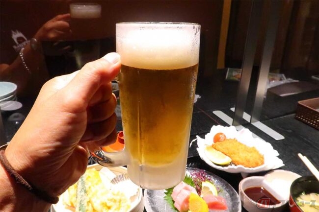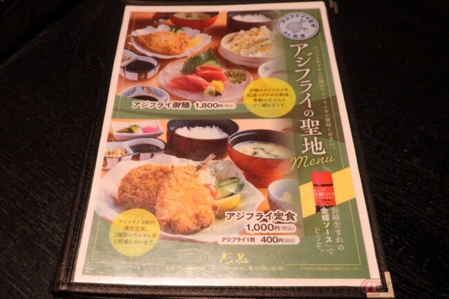 席に案内されながら生ビールをオーダーし、走行距離約1200km分の疲れた身体に染み渡るビールを感じつつメニューを見ます。すると、なんと「アジフライの聖地Menu」があるではないですか! アジフライが2枚の王道「アジフライ定食」と、アジフライ1枚に松浦で水揚げされたマグロの刺身、松浦産野菜の天ぷらが豪華セットになった「アジフライ御膳」の2種類が聖地メニューです。これだけ走ってきたのだから、ここは自分へのご褒美ということで「アジフライ御膳」をオーダーします。アジフライ1枚じゃ寂しい、という人は1枚400円で追加オーダーすることも出来ます。