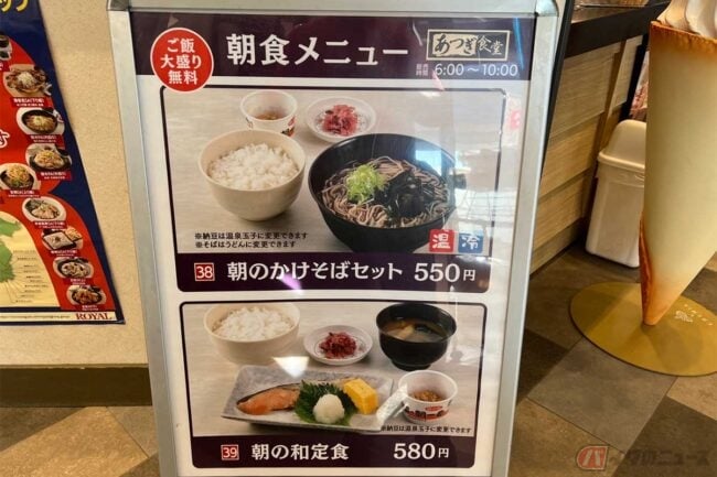 以前も「国産豚の肉そば」や「かけそばミニしらす丼セット」などをいただきましたが、いずれも味は満足できるものでした。今回は6時から10時まで限定販売されている、朝食メニューから選びます。「朝のかけそばセット」(550円)と「朝の和定食」(580円)の2種類があり、どちらもご飯大盛り無料、前者をオーダーしました。