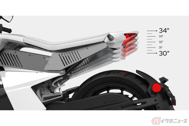 簡単に取り外し可能な4.3 kWhバッテリーパックを軽量なステンレス製モノコックシャーシに搭載するAnthemでは、様々な体型のライダーに対応するため、電子制御で車高を調整できるエルゴ・イージーシートを採用。