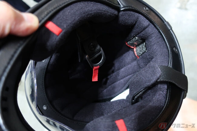 一方、内装が取り外しできない「固定式内装タイプ」のヘルメットの場合は、中性洗剤の水溶液で内装を拭いていきます。