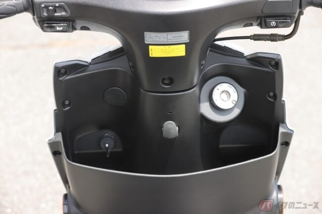 他に備わっている機能面でいうと、ハンドル下に大きいソケットとUSBポートが付いているから、これは今やスクーターに必須と言っても過言ではない通勤・通学に持ってこいの装備だよね。コンビニフックはハンドル下とシート下(足元側)に合計2つ備わっていてお買い物にも便利。シート下収納はフルフェイスが入る大きさではないけど、ジェットヘルメット1つくらいなら入りそうな容量だったよ。