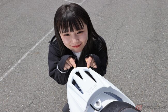 私の身長(158cm)で、膝を曲げて両足かかとまでベッタリ地面に着いたよ。鋭利な見た目とは裏腹に、シートはフカフカしていてお尻に優しい柔らかさだったので一安心。座った状態でハンドルを切ったり車体を傾けても、車重が軽いおかげで不安なく扱えそう。これは女性でも余裕で取り扱えるね。