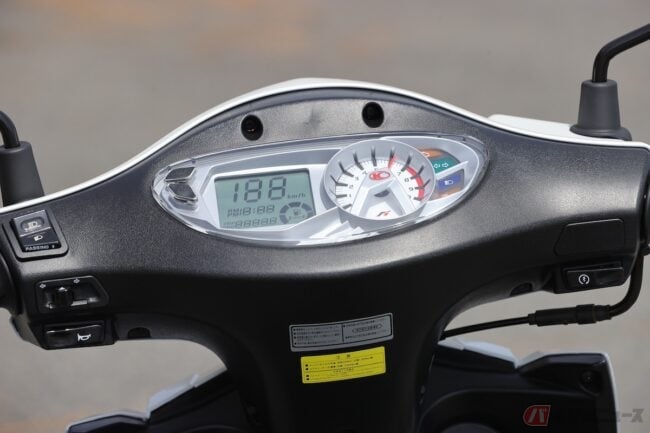 私の好きポイントを他にも挙げると、リアとフロントのLEDライトカバーが水色がかっているところに清涼感を感じた。あとライト周りの枠の部分?がキラキラして見えて可愛いし、シートも二色使いのカバーでステッチがオレンジになっているのも技が細かくて好きだなぁ。そういうかわいさの反面、シュッとしたマスクだったりカウリングが可愛さに振りすぎていないところに男女共に選ばれる要因を見たよ!
