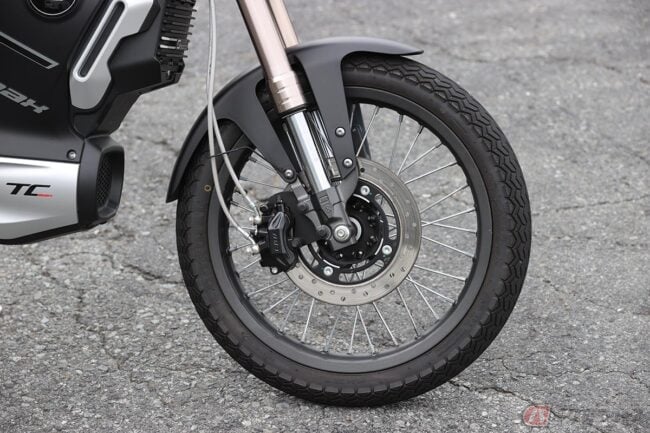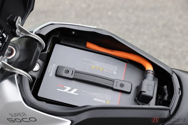 TC MAXが搭載するバッテリー(定格容量3240Wh(72V 45Ah))は1個で、航続距離は110km(体重75kg のライダーが45km/h で定地走行した場合の数値)。高速道路を走行できる電動バイクであることを考えるともう少し、を求めたくなります。しかし同時に、この軽さとスリムさを実現していることを思えば、そういうバランスの電動バイクだと言えるのかもしれません。