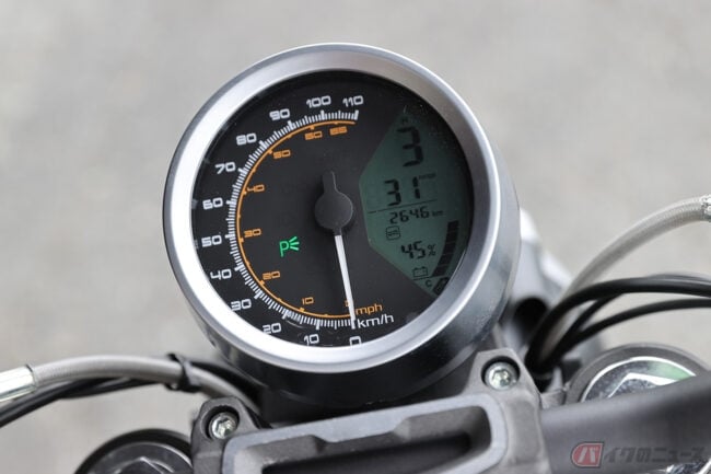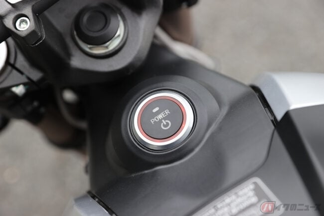 まず目を引くのが、すっきりとした車体です。例えば250ccから400ccの内燃機関のバイクで考えれば、単気筒、またはそれ以上に横幅がスリムなのです。またがってみればその印象のまま、すんなりと足を下ろすことができ、シート高770mmの数字以上の足つきのよさを感じます。