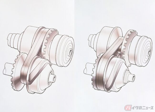 ATとDCTは、構造が全く異なります。車のATにはさまざまな方式がありますが、バイクに採用されるATは「CVT(Continuously Variable Transmission)」が一般的です。無段変速機とも呼ばれるCVTには、従来のMT車のようなミッションギアがありません。その代わり、エンジン側とタイヤ側それぞれにプーリーがあり、その間にあるドライブベルトがエンジンパワーをタイヤに伝達します。