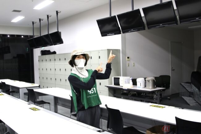 メディアパスを申請後、プレスルームの天井を見上げると多くのモニターがあります!どの席の上にも一列ずつモニターが配置されており、現場のLIVE映像や順位などが流れています。私も編集部の先川さんからタイミングモニターに書かれている文字の意味を教わると、確かにこれだけで現場の状況はほとんど認識できてしまうことがわかります!