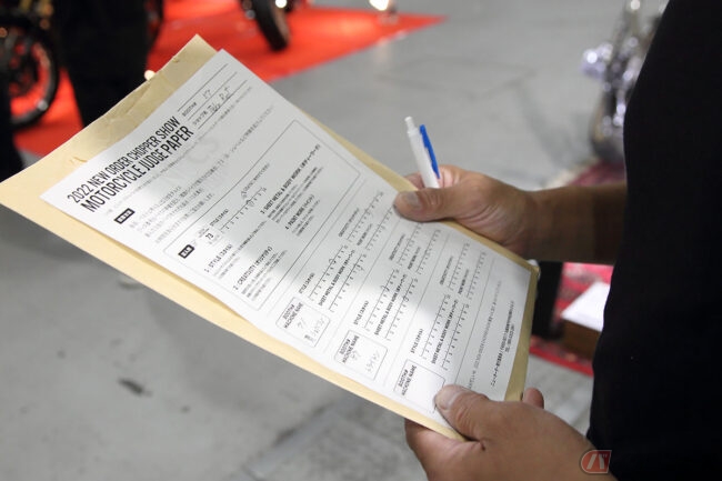 NOCSは、会場の出展カスタムに対して、エントリーしたビルダーたちがお互いを審査する「ビルダーズチョイス」という方式でアワードの順位を決めるコンペティション(協議会)としての側面を持つのですが、今年は「スタイル」や「メタルワーク」、「ペイント」など、より細かく審査項目と点数分けがされたジャッジペーパーを採用。