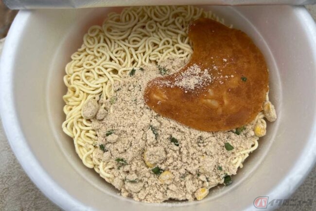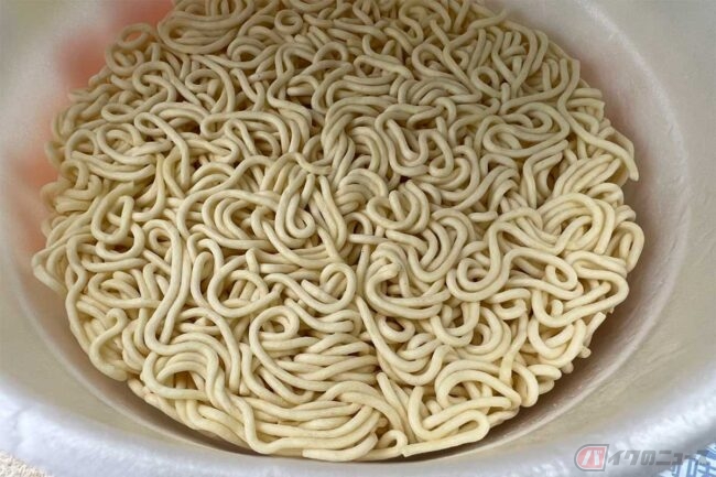 このカップ麺のスープは10種の豚骨エキス、ニンニク、玉ねぎ、黒胡椒などをブレンドして生み出されたようです。調味油は食べる直前に入れますが、これが豚骨の香りを引き立てていて、食欲をそそるものでした。