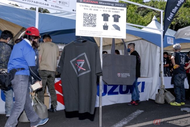 酷暑の中、並んでも欲しいのは『KATANAミーティングオリジナルTシャツ』(3000円)、『KATANAミーティングオリジナル キャンパスマルチトートバッグ』(1500円)、『KATANAミーティングオリジナル 折りたたみ傘』(2000円)といったイベント限定オリジナルグッズたち。いずれも大人気で、編集部スタッフも「自分はトートバッグを!」と、列に並んで購入するのでした。