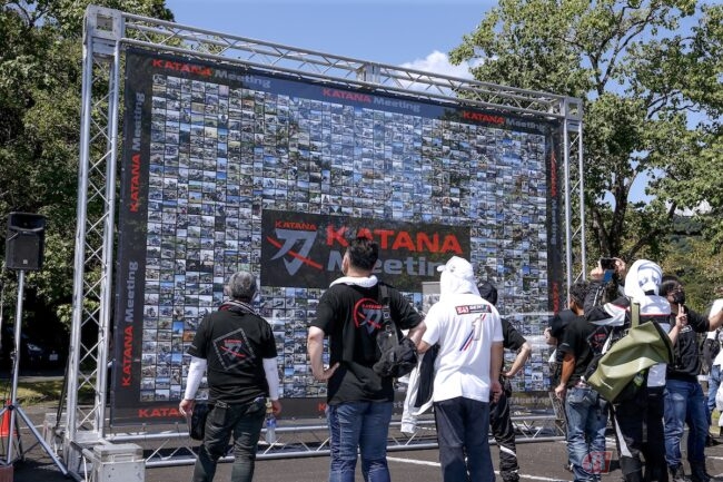 まずは『KATANAビッグフラッグプロジェクト』の前で記念撮影。昨年開催された「KATANA Meeting 2021」オンラインイベントにて、ライダーたちからの投稿を使って幅5.4m×高さ3.6mの大型フラッグが製作されました。自身のKATANAを探し出すのが、来場者らの楽しみになっているのです。