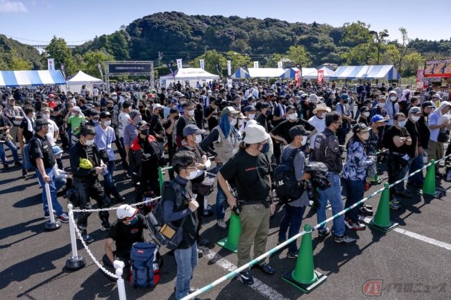 9時の会場オープン前から、多くのライダーたちが押しかけました。大半の人のお目当てはオリジナルグッズで、10時の販売開始前から長蛇の列となってしまいます。