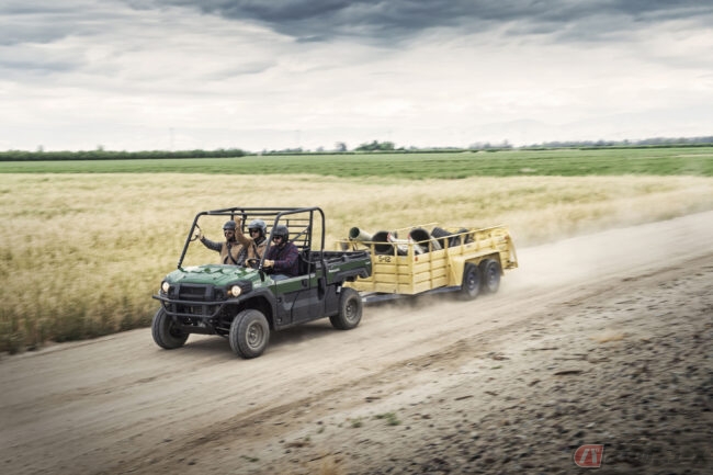 縁の下の力持ちとして農場や作業現場で活躍するユーティリティ・ビークル(多用途四輪車)であるMULE(Multi-Use Light Equipmentの頭文字から命名)シリーズのMULE PRO-FXT EPSは、農場や牧場などにおいて特に重視される低速回転域でのパワフルな走りと不整地走破性、耐久性を高いレベルで実現したモデルで、後列シートを格納し、荷台の広さを変えることができるカワサキ独自の「イージートランスキャブシステム」を採用。優れた利便性により、世界中のプロフェッショナルたちに愛用されています。