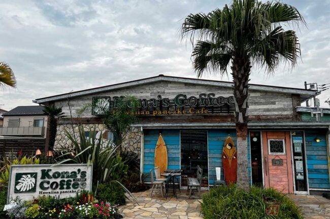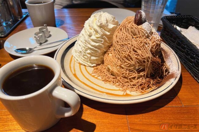 食後にコーヒーを、とYさんの案内で向かったのは「Kona’s Coffee(コナズコーヒー)茅ヶ崎店」です。筆者はコーヒー、Yさんはコーヒーと期間限定の「モンブランパンケーキ」なるものをオーダー。あれだけ食べたのに更にモンブランクリームとホイップクリームが山脈のように盛られたスイーツを食べられるとは、女性の別腹は恐ろしい……。