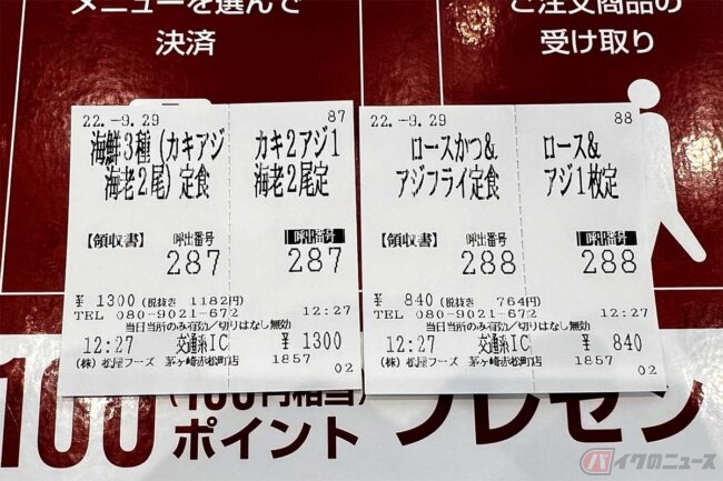 店に入ると左に「松屋」、右に「松のや」券売機があります。右の券売機をタッチしてアジフライを選びます。アジフライを含んだ定食がいろいろありすぎて目移りする筆者です。ここへ来るまでは「アジフライ(2枚)定食」の一択だったのですが、同行したYさん(女性)がいきなり「海鮮3種盛合せ定食(カキ2個・アジ1枚・海老2尾)」というキングオブ海鮮フライ的なメニューを選んだのです。