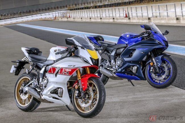 ヤマハが初めてWGP(世界選手権ロードレース)に参加してから60周年を記念して登場したこのアニバサーリーモデルですが、YZF-RシリーズのYZF-R1、YZF-R7、YZF-R6、そしてYZF-R3の4種類がラインナップしています。