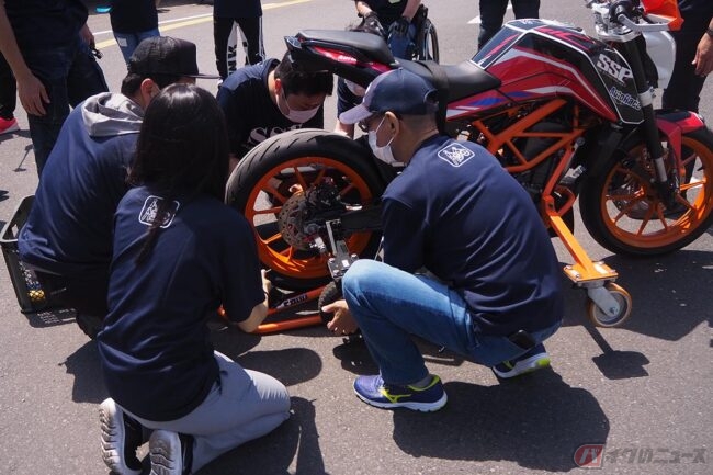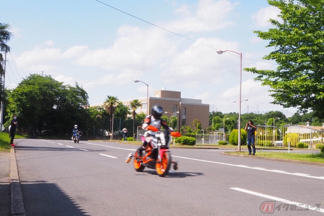 一番初めに使用する車両は、KTM「DUKE 390」で、最初の一歩として補助車輪を付けた状態で走るところから始まります。