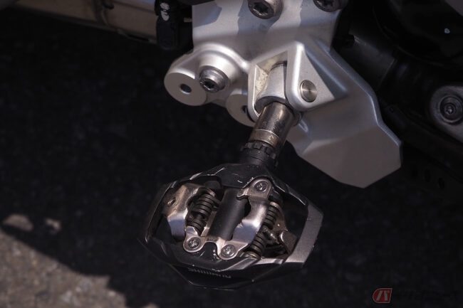 足元のステップには自転車のビンディングペダルが取り付けられており、ライディングブーツにもそのペダルに固定できるようにクリートが装着されたものを使用。乗車後ベルトを取り付けて、身体とバイクをしっかりと固定させます。