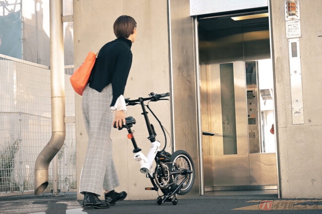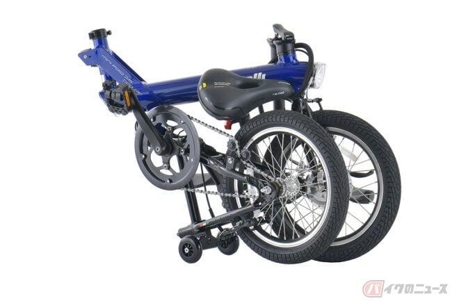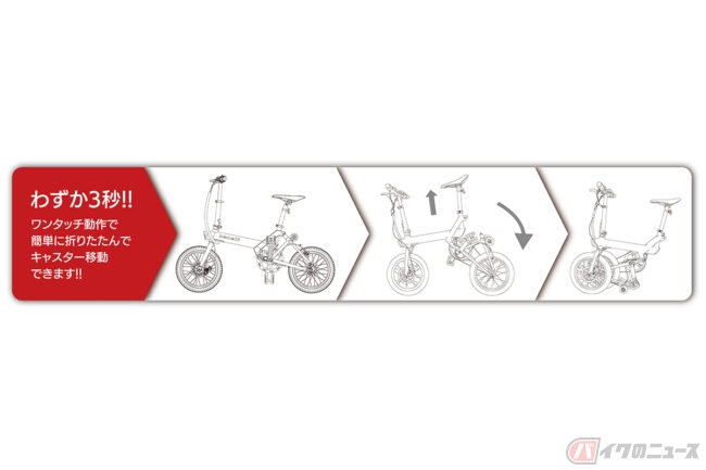 小径車の不安定感を克服したフロントモーター・リア人力の2WD構造、折り畳みの煩わしさを克服した3秒折り畳み、キャスター移動のクイックトランスフォーメーション仕様とされています。