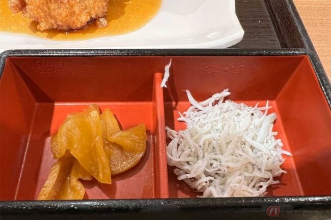 油淋鶏(ユーリンチー)は鳥の唐揚げに甘酢醤油、生姜、ねぎ、ごま油などのソースをまぶした中華料理のひとつです。なぜ海鮮系のメニューに並んでいるのかわかりませんが、出来上がりを見ると、大きめの唐揚げが4つとキャベツのサラダ、味噌汁、沢庵、そしてちょっと嬉しいしらす干しという内容でした。
