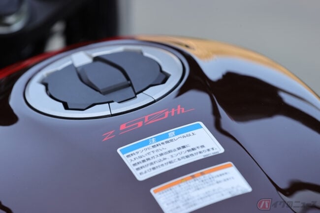 タンクの中心部分がせり上がっているということは、当然、燃料が減っていくとガソリンが左右に分割されることになり、そしてタンク内の左右の溝のように深くなっている場所に、最後にガソリンが残ります。この際に、燃料が最後に溜まる場所に燃料ポンプやホースが取り付けられていれば、ガソリンを最後まで使い切ることができるでしょう。