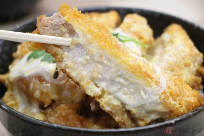 そして「カツ丼・上」もきました! 一見すると普通の「カツ丼」ですが。トンカツ1枚を5つに切り、ひとつは横に詰めて丼いっぱいに盛られています。これは相当デカいトンカツではないでしょうか!? それに厚みが半端ない!